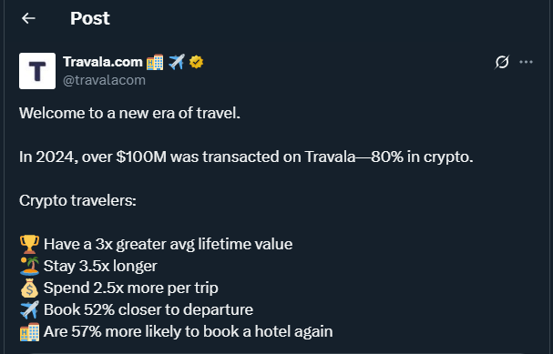 - In 2024, Travala reached $80 million in bookings paid with cryptocurrencies, a 78% increase compared to the previous year.