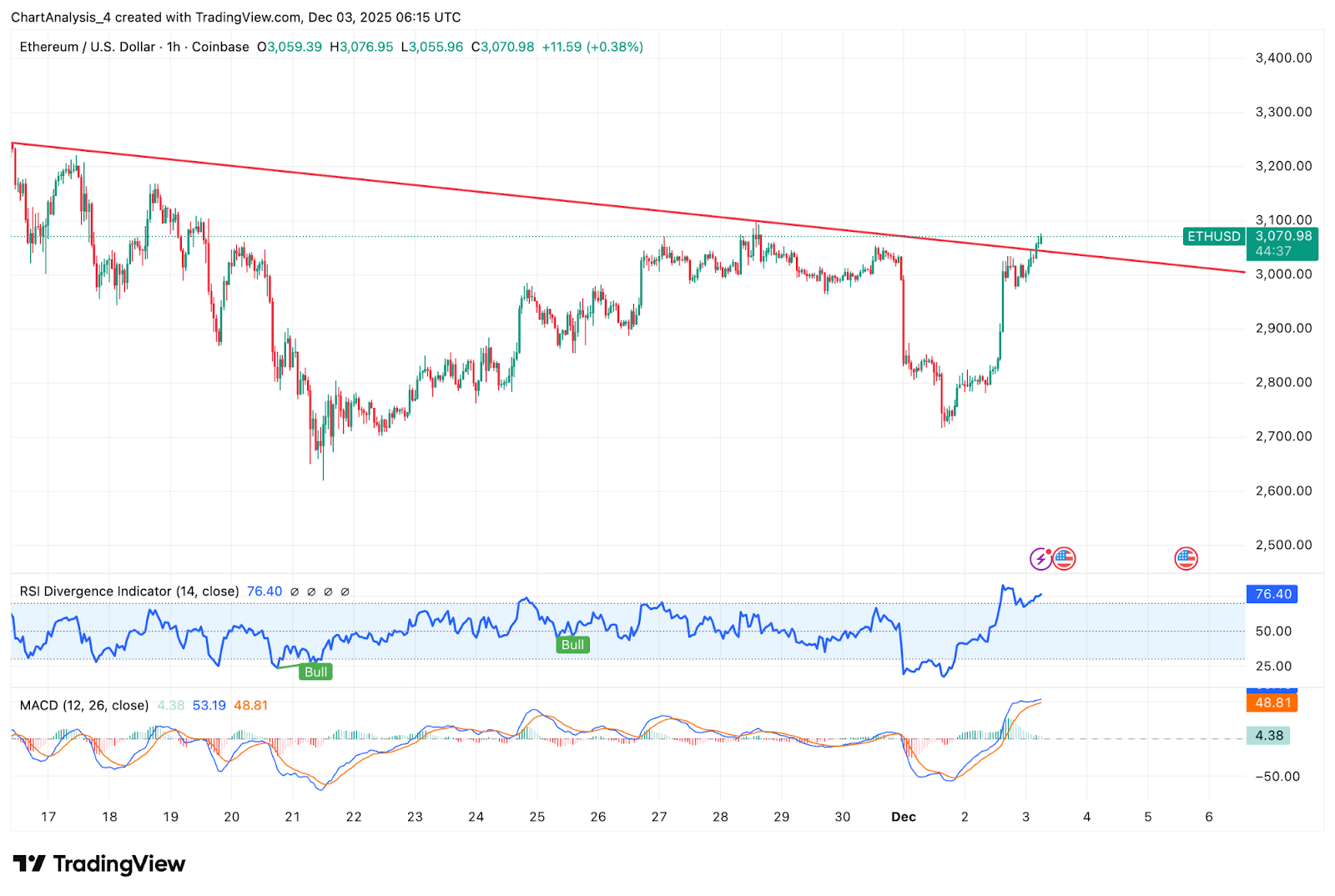 The 1-hour chart provides a clearer view of intraday conditions. Ethereum broke above a descending trendline that rejected multiple rallies during November and early December. Price has moved sharply higher, but the RSI has reached overbought levels above 76, reflecting both strength and elevated risk of near-term pullback.