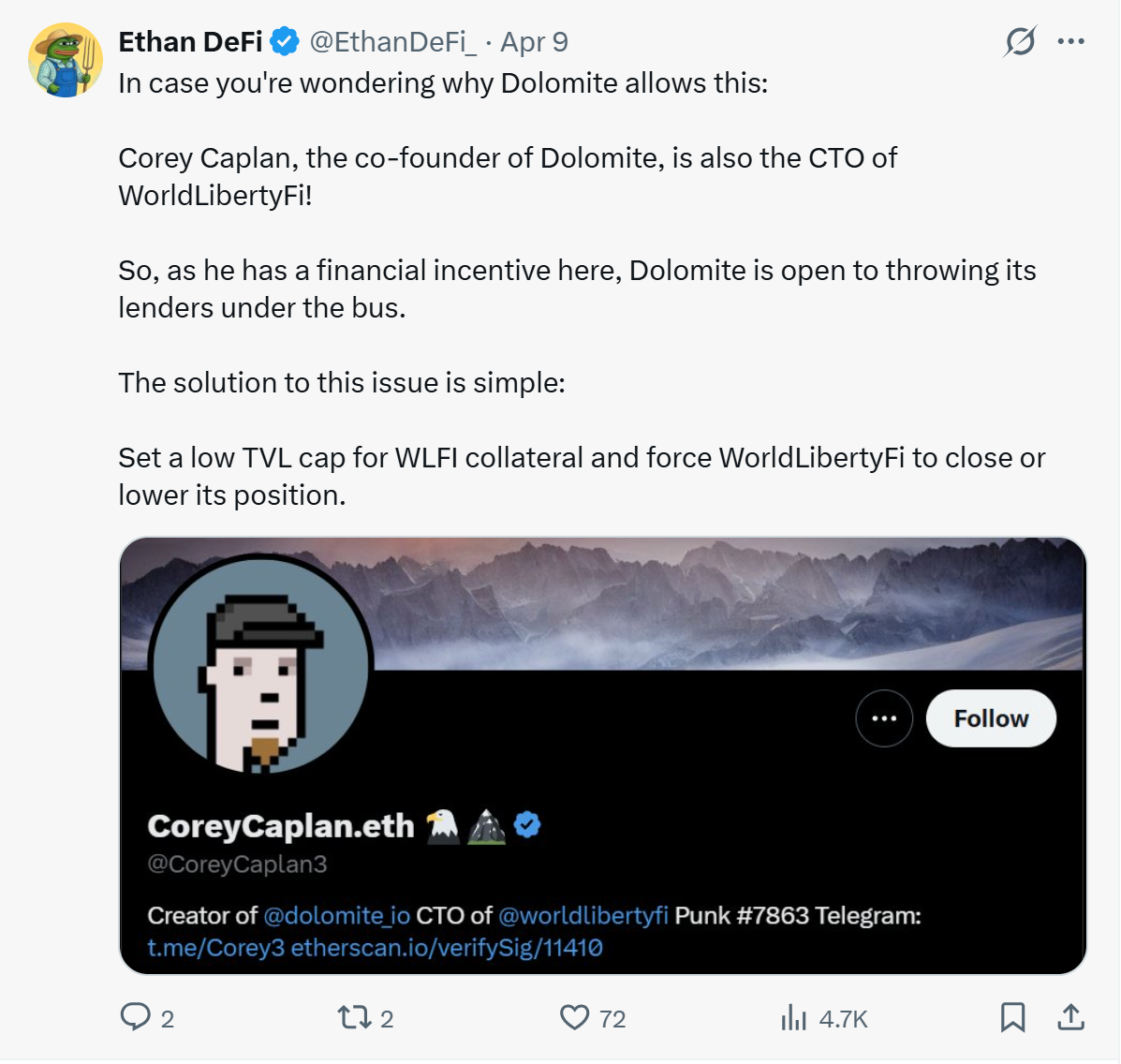 The downturn came after it was revealed that wallets linked to World Liberty Financial deployed substantial $WLFI holdings as collateral on Dolomite, a decentralized lending platform co-founded by the project’s chief technology officer, Corey Caplan.