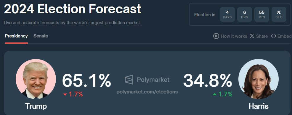 While Donald Trump leads at 65% against Kamala’s 34.9%, recent research has raised worries about Polymarket’s legitimacy and accuracy.