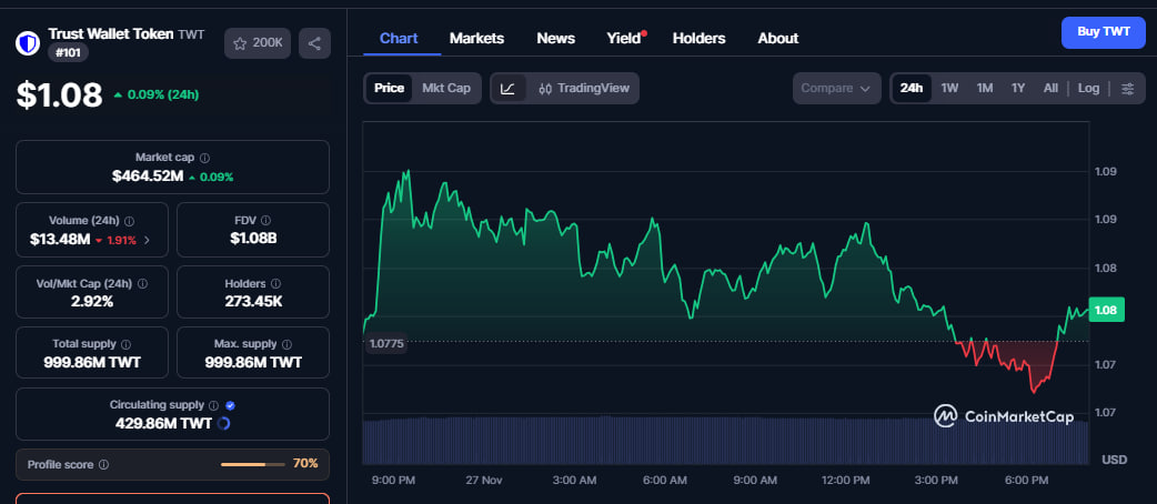 TWT has consolidated over the past week after losing nearly 15% in the last 30 days, influenced by broader selling pressure.