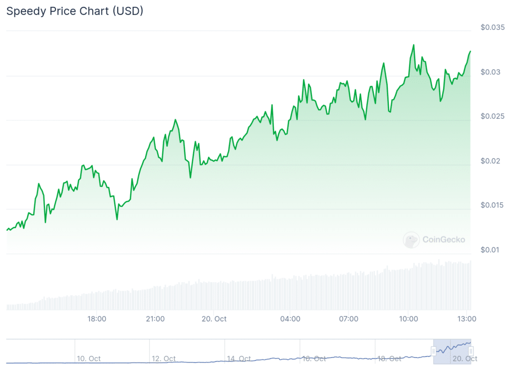 The team behind Speedy, which includes experts in blockchain technology like Gonzales Spidorius serving as the CIO, saw the token spike over 150%. The coin’s all-time high hovers at around $0.03346; its all-time low was on Oct. 20, at $0.0007253.