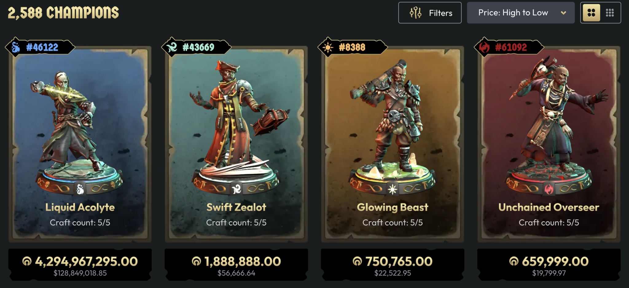 Champions Tactics is a PC game that involves battling collectible figurines that are also sold as NFTs. Currently, its marketplace lists one NFT for a staggering $129 million, and the second highest is listed for almost $57,000. On the other end of the scale, many of these figurines are worth between $5 and $6.