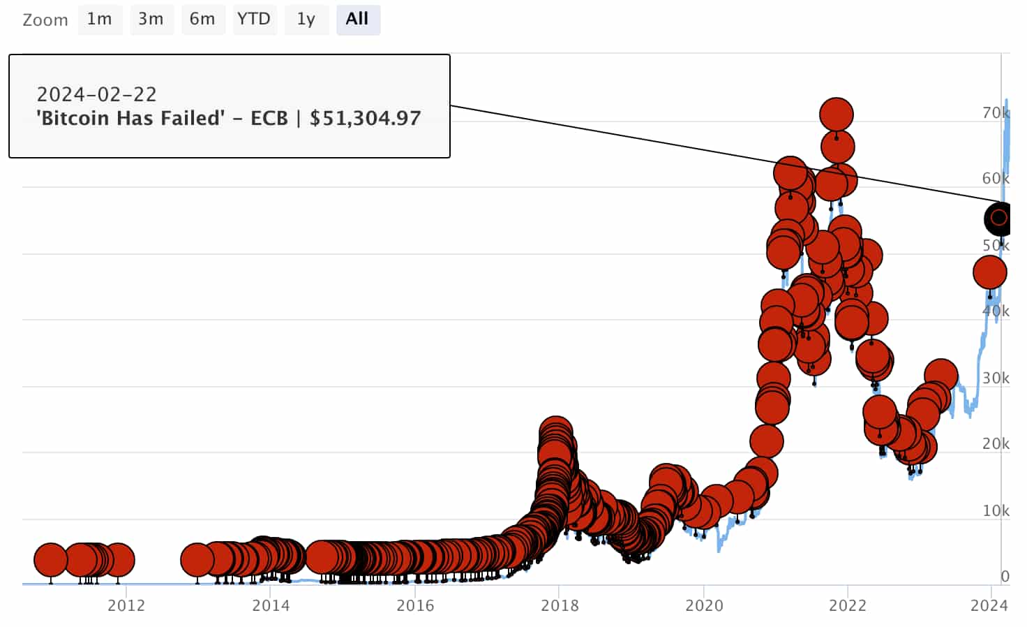 Throughout its history, Bitcoin has been deemed a failure and declared dead by critics and skeptics. Interestingly, Bitcoin’s price has increased by $21,000 since the last time it happened in 2024.