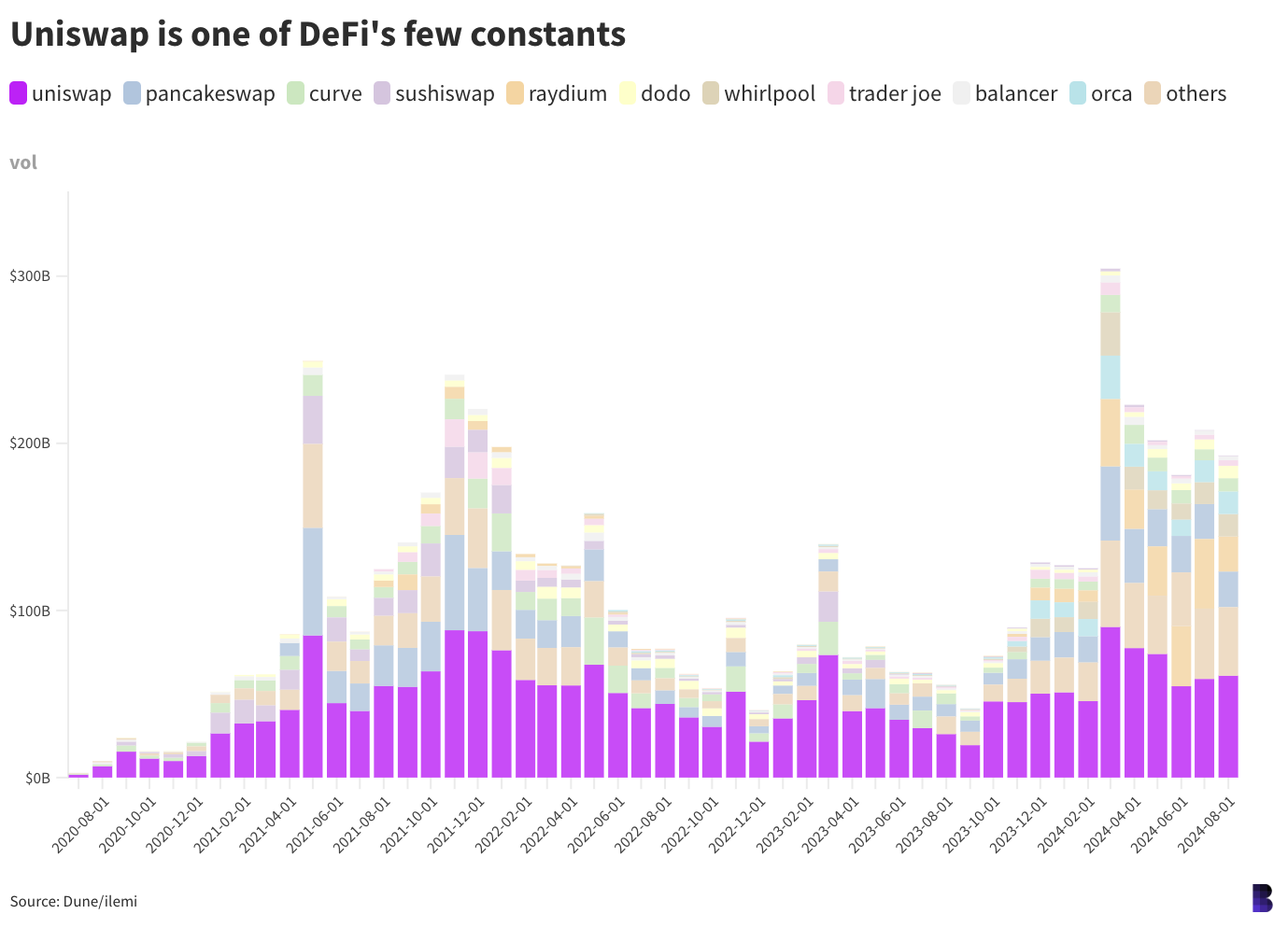 The firm itself is a bedrock of DeFi, on par with Maker (which has recently rebranded to Sky). Uniswap volumes have stayed relatively consistent over the years despite waves of new trading platforms looking to eat its lunch.