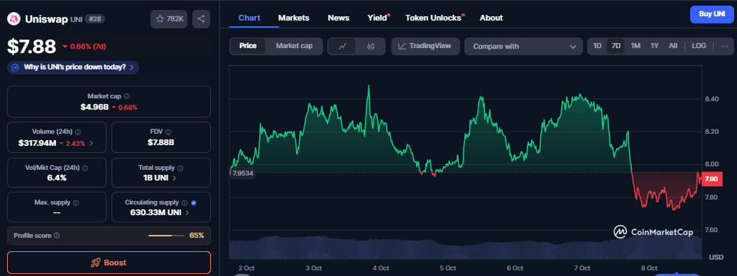 UNI is trading at $7.88 after losing nearly 20% of its value the previous month.