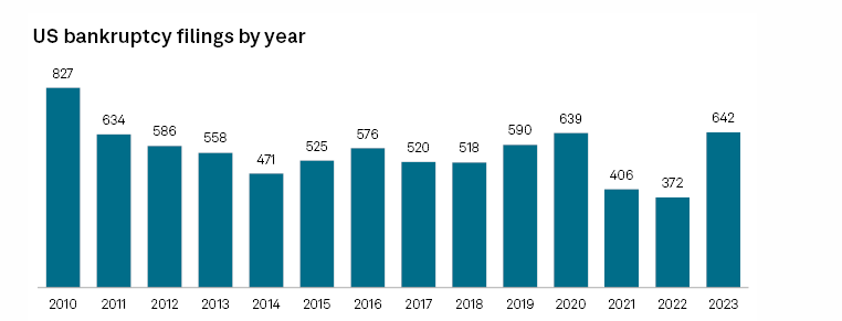 New data from market intelligence firm S&P Global shows 2023 saw a total of 642 bankruptcy filings – the highest level since 2010 when there were 827 bankruptcy filings.