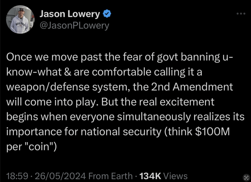“Once we move past the fear of govt banning u-know-what & are comfortable calling it a weapon/defense system, the 2nd Amendment will come into play. But the real excitement begins when everyone simultaneously realizes its importance for national security (think $100M per “coin”)”