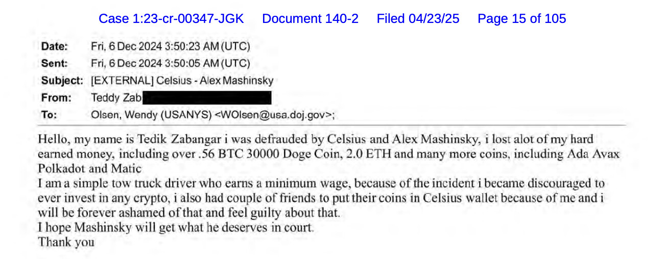 The victim letters sent to the court, written to Wendy Olsen, Victim/Witness Coordinator in the US Attorney’s Office. They talked about how Celsius caused stress in families, a lot of debt, and the loss of retirement plans. Many of the statements say that Mashinsky lied to investors about Celsius’s financial health, even though the company was almost bankrupt.