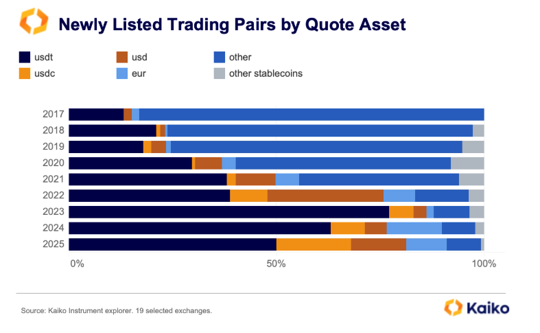 New pair listings for USDT slowed down in 2025, as some traders abandoned the asset and switched to USDC. | Source: Kaiko Research