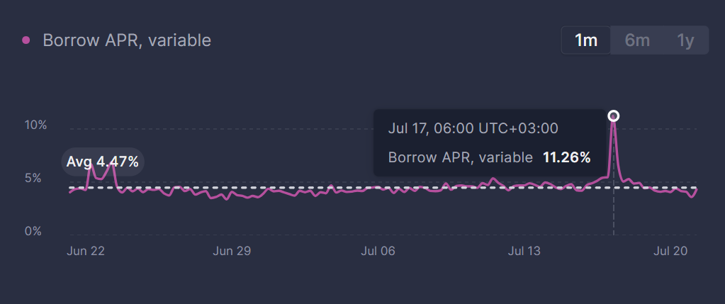 On July 16 and 17, Aave’s USDT supply APY surged from typical low single digits to nearly double digits, with borrow rates briefly topping 11%, a level last seen since January 2025.