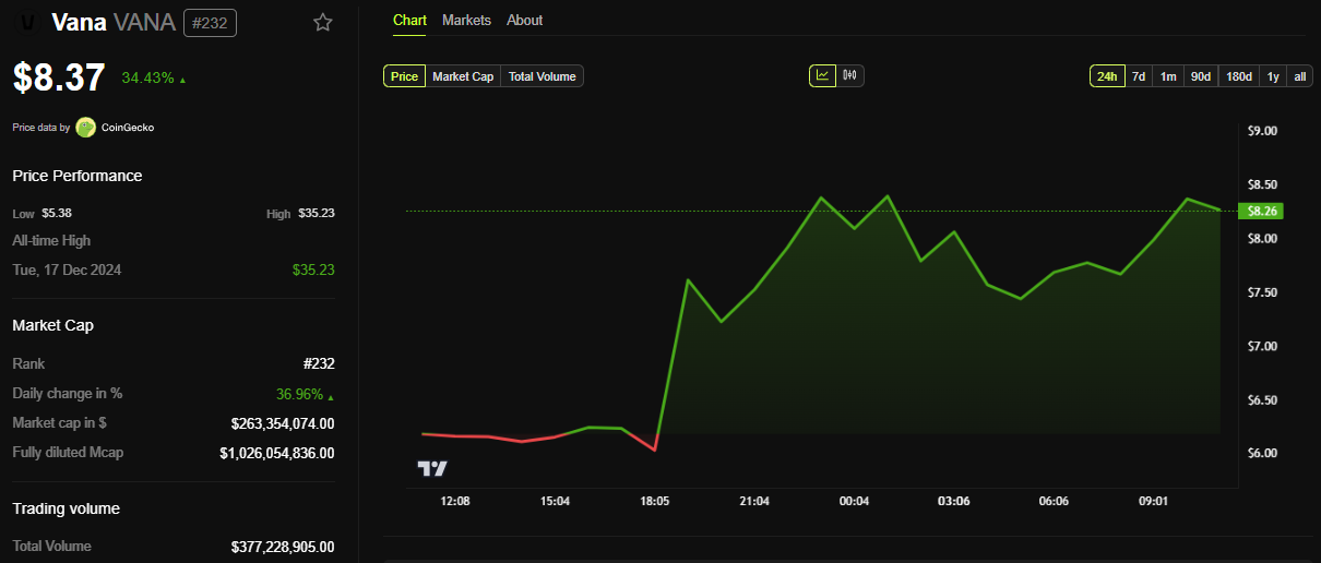 According to BeInCrypto data, the VANA token was up by almost 35% to trade for $8.37 as of this writing.