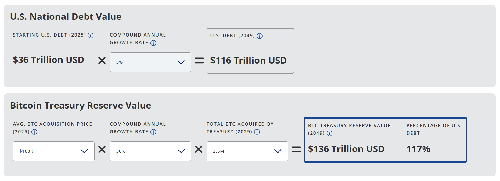 A new tool from VanEck, a leading asset management firm, models how a Bitcoin reserve could offset U.S. national debt by 2049.