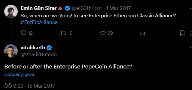 The Tweet in question consists of Avalanche (AVAX) founder Emin Gün Sirer’s humorous approach to Ethereum Classic at that time, and Buterin citing PepeCoin as an example. However, today’s PEPE had not yet been released to the market in those years. PEPE was launched as memecoin about a year ago and has gone through turbulent times.