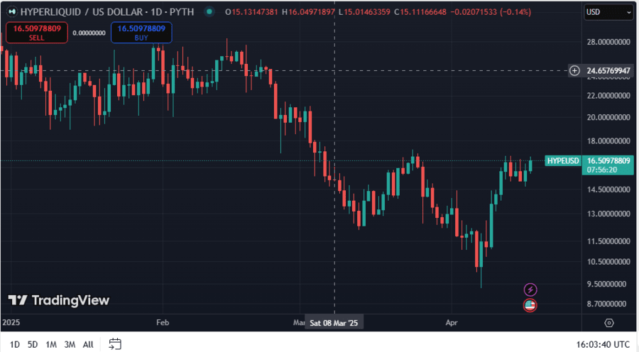 Several on-chain indicators point out this recent buying activity and a looming HYPE’s price surge. First, looking at trading chart, the altcoin’s price is currently standing at $16.60, up 9.2% from yesterday. HYPE has been experiencing an impressive uptrend in weekly, biweekly, and monthly timeframes, with its prices up by 20.1%, 48.0%, and 25.8%, respectively. This green figures show that Hyperliquid has recently been experiencing substantial buying pressure, as both small investors and whales are accumulating the token, contributing to noticeable price rises. This shows that long-term buyers continue heightening their accumulations, optimistic for future price growth.