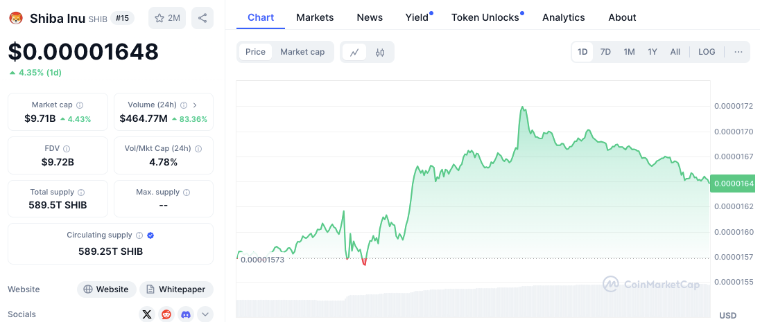 Shiba Inu is currently trading at $0.00001650, showing a 4.91% increase in the past 24 hours. Its trading volume has surged by 83.38%, reaching $464.89 million, showing rising investor interest.