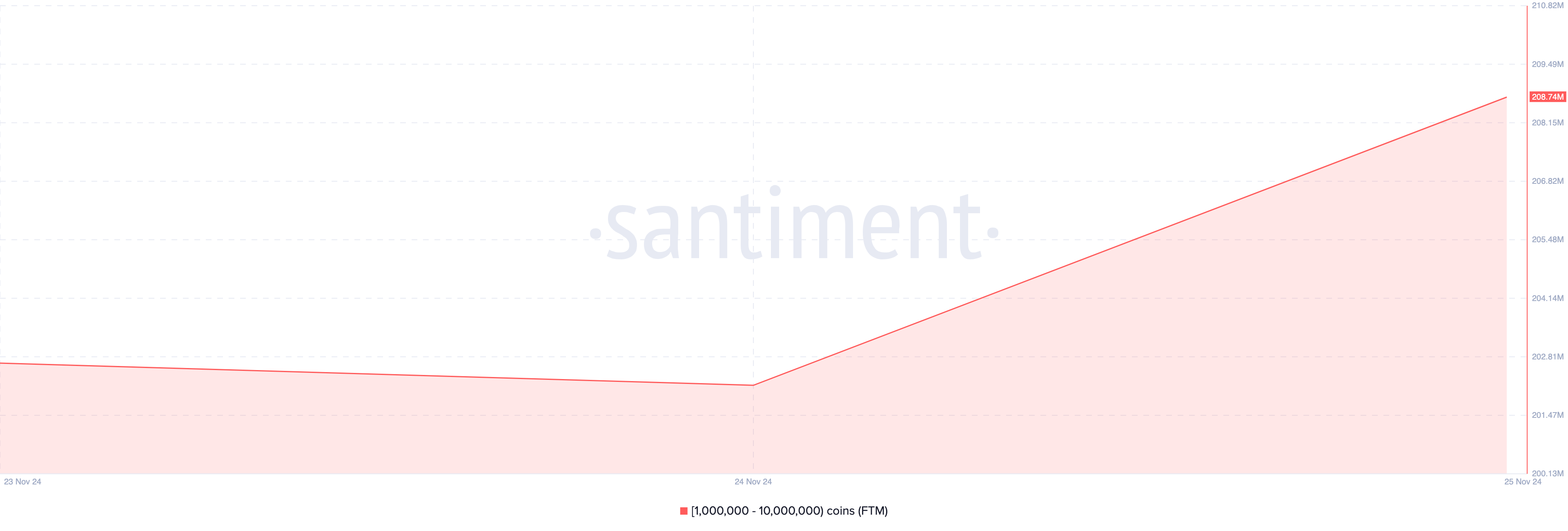 According to Santiment, the balance of wallet addresses holding 1 million to 10 million FTM was about 202 million on November 24. But today, it has increased to 208.74 million, suggesting that whales could be gearing up for a notable FTM rally.