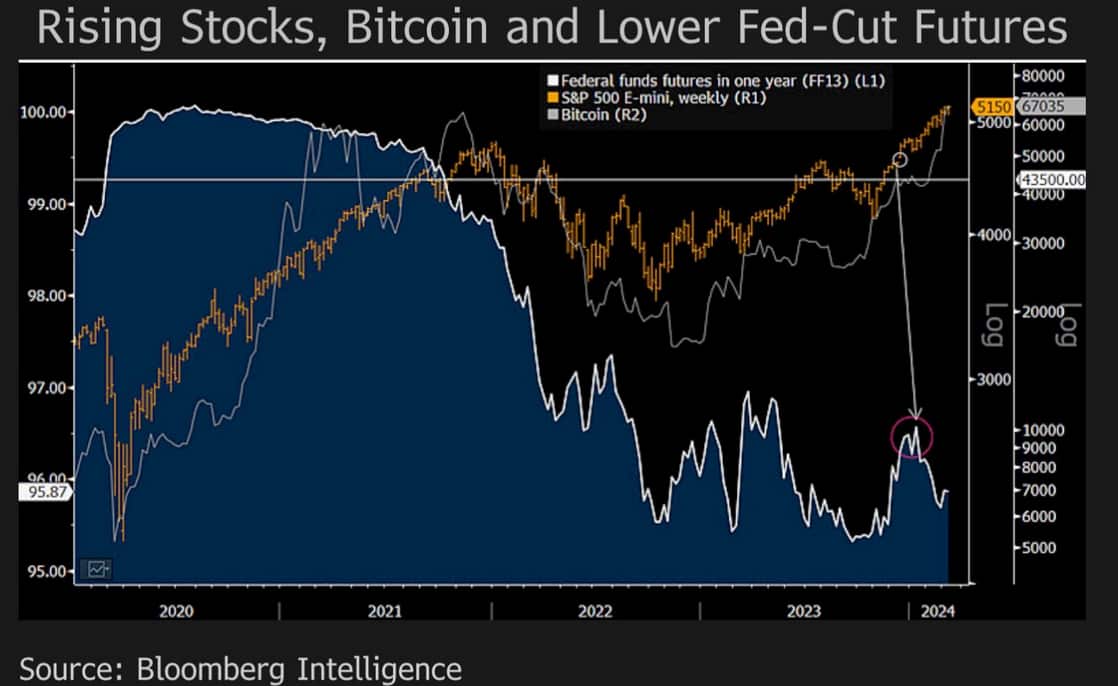 Connecting the dots, McGlone’s analysis underscores a direct linkage between diminishing Federal Reserve rate-cut expectations and the surge of both the S&P 500 and Bitcoin. This correlation suggests that while stock and cryptocurrency markets thrive, underlying expectations of monetary easing hint at concerns over economic sustainability.