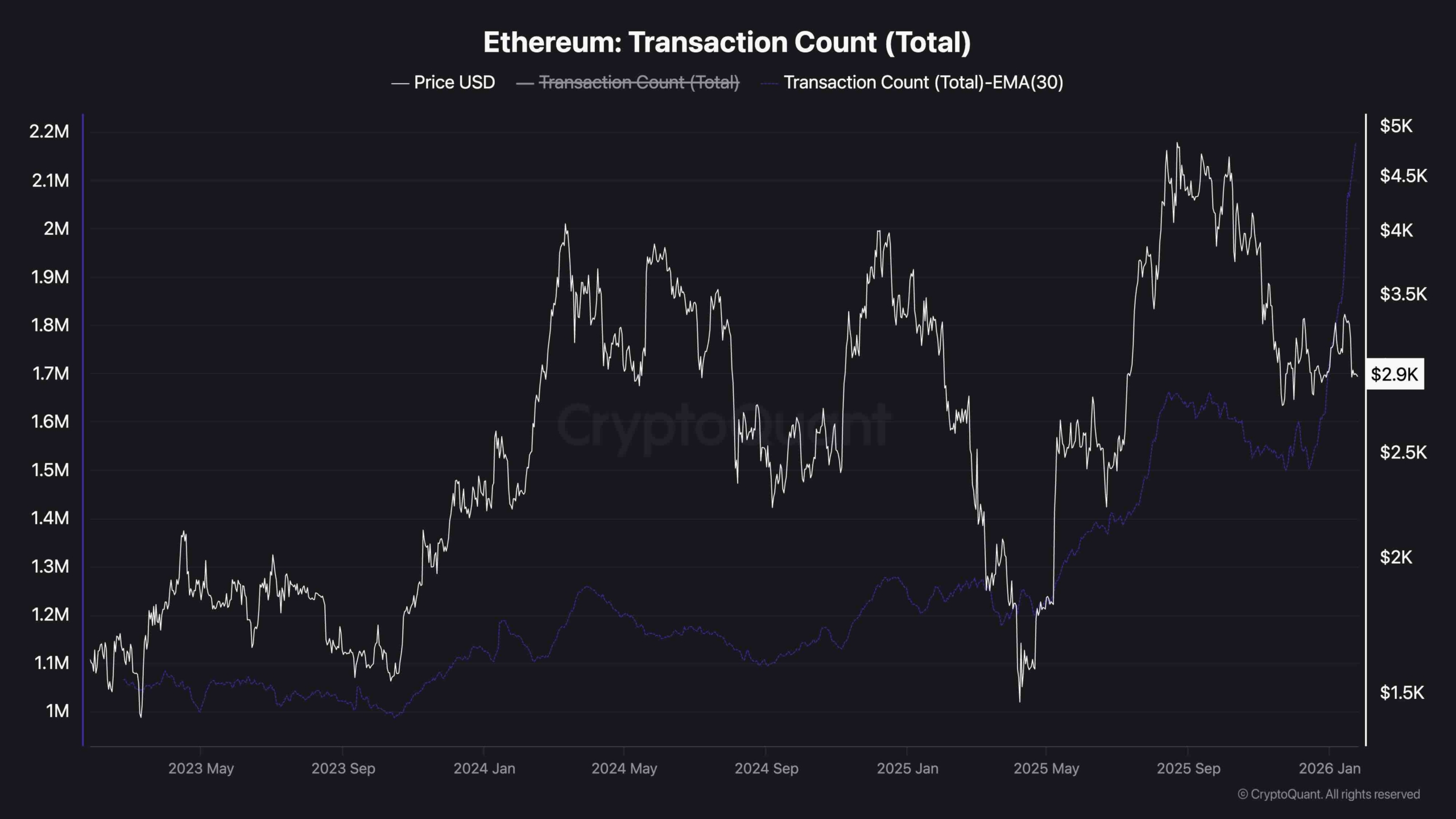 Looking at on-chain activity, Ethereum’s total transaction count and its 30-day EMA have been trending higher from the depressed levels seen in early 2025, even as the price has recently corrected from all-time highs back toward $2,900. This combination of declining price and rising transactional activity often reflects a shift from speculative excess toward more organic network usage, as weaker hands reduce exposure while a base of active users remains engaged.