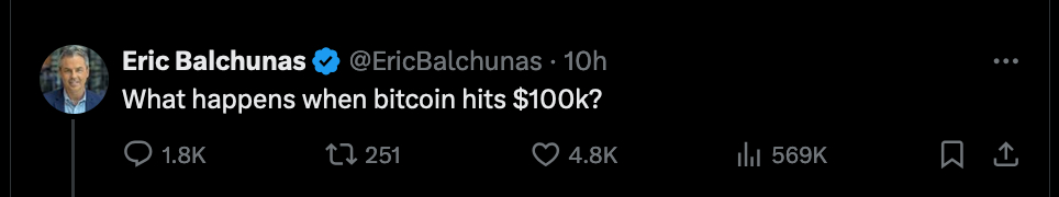 “What happens when Bitcoin hits $100k,” asked Eric Balchuas, Bloomberg’s senior ETF analyst, who has been actively covering BTC ETFs. His post on X got over 1,800 comments in 10 hours, with many analysts and commentators giving their opinion.