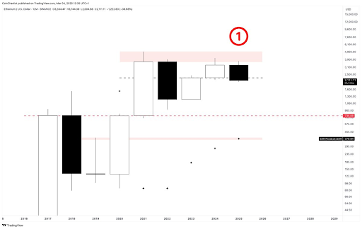 In an X post, Tony Severino provided a Japanese candlestick, TD Sequential and Parabolic SAR analysis of the 2024 and 2025 Ethereum price action. He noted that ETH’s 2024 candle made a lower high both on a candle close and wick high basis. On the other hand, he revealed that 2025’s candlestick is currently a bearish engulfing with the candle body fully engulfing 2024’s candlestick and is entering 2023’s candle body.
