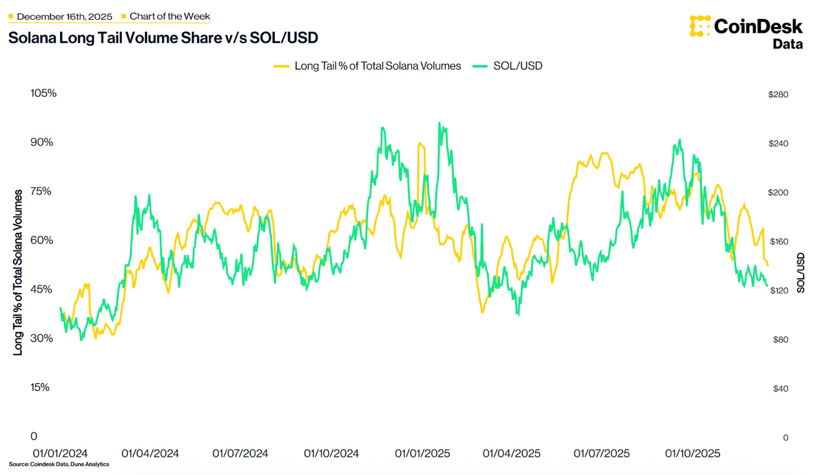The share of Long Tail token volumes on Solana has dropped to 55%, reaching its lowest point since the second quarter of 2025. Historically, the price of SOL has generally mirrored the movement of this Long Tail volume market share, which acts as a proxy for speculative or ‘gambling’ interest on the chain. Consequently, without a new, clear catalyst to drive a pickup in the Long Tail volume share from these reduced levels, the momentum required to push the SOL price significantly higher appears.