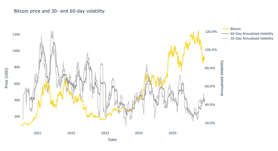 In 2025, the relationship between bitcoin’s price and its volatility continued to more closely resemble equities. Volatility and price moved inversely, and vol remained very low during bitcoin’s two ATH events in the Summer. More pronounced “put skew” in options prices suggests that ETF and DAT option behavior is having a greater influence. The era of bitcoin’s price-up + vol-up “meltups” may be over.