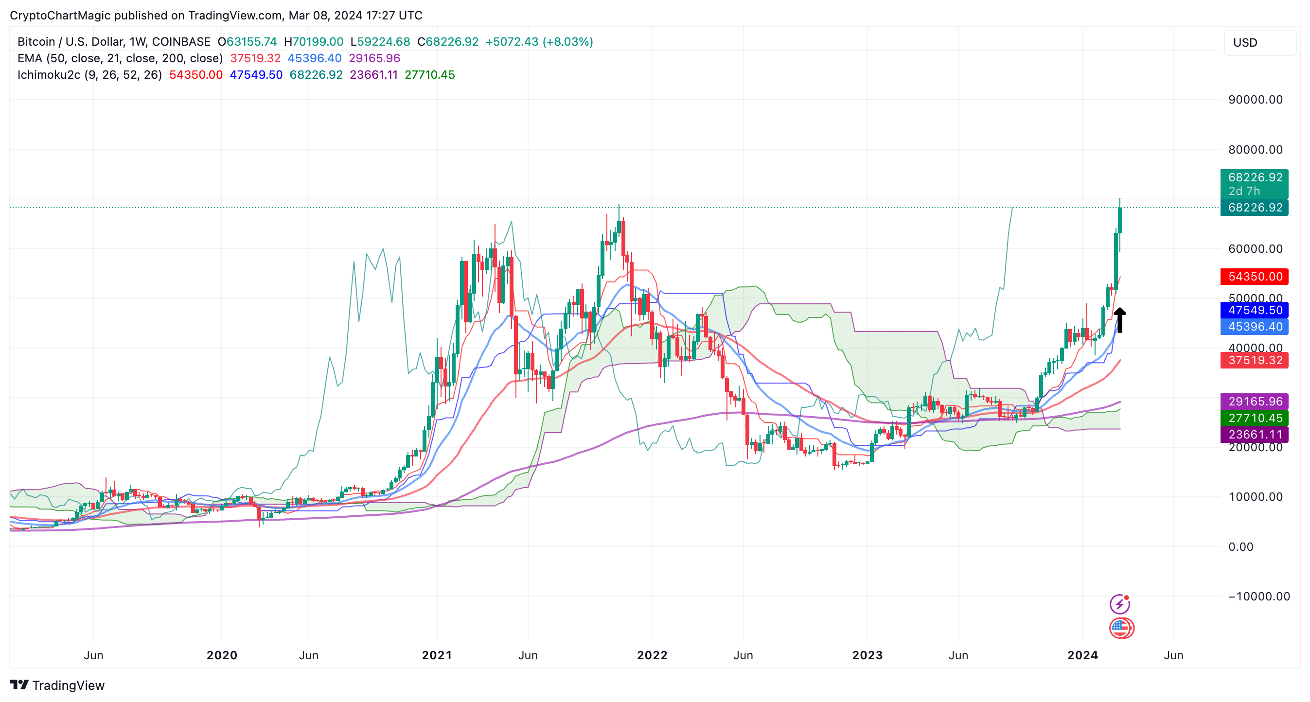 Bitcoin price made another surprise move on Friday during US business hours, where it briefly escaped the sell wall at $69,000 to touch new highs at $70,000. The largest crypto is standing strong despite calls for a retracement, considering the rally from lows under $40,000 in January.