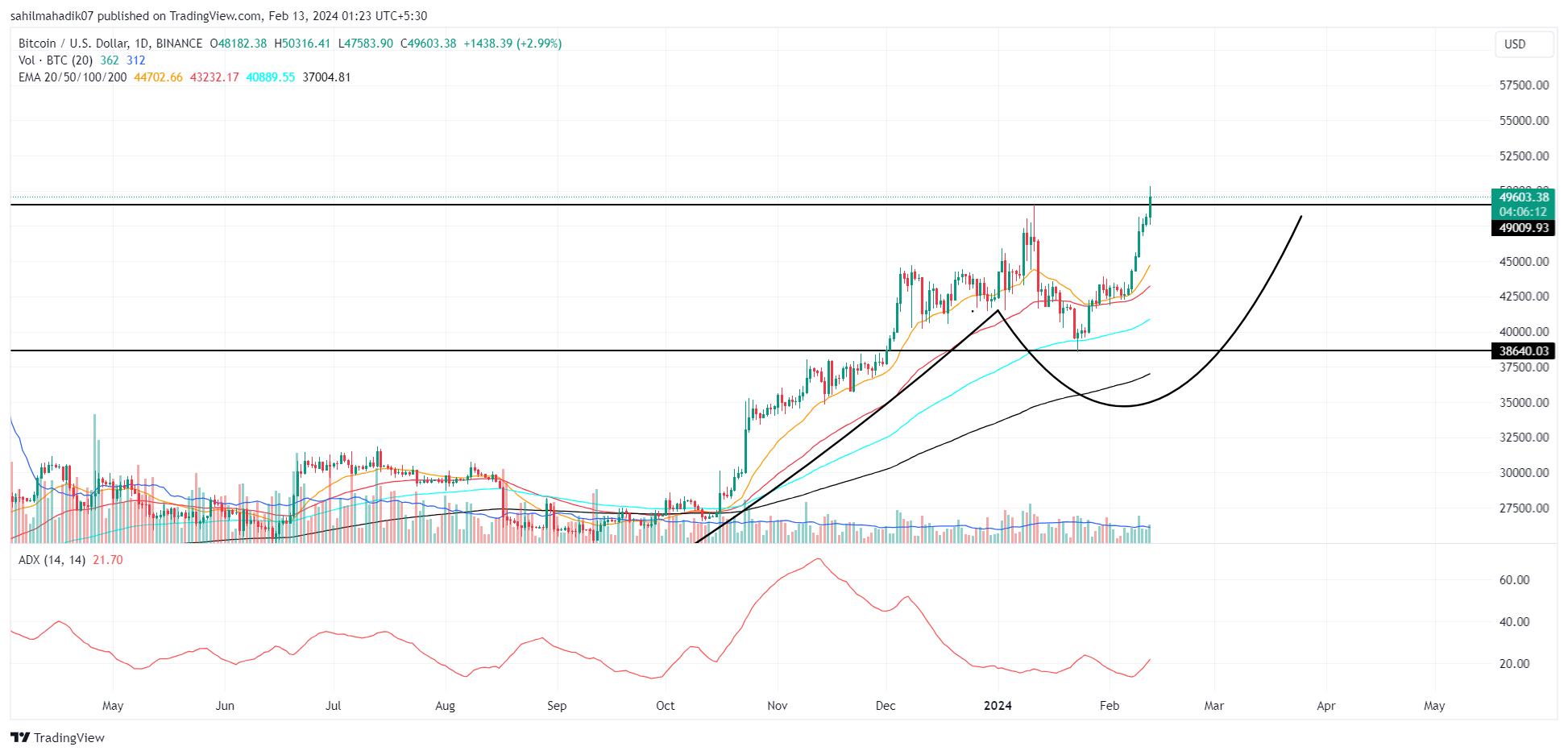 This pattern developing for nearly two years is poised to have a major impact on Bitcoin price. Currently trading at $49912, the price will likely witness a minor pullback in the coming days to showcase its sustainability for higher levels.