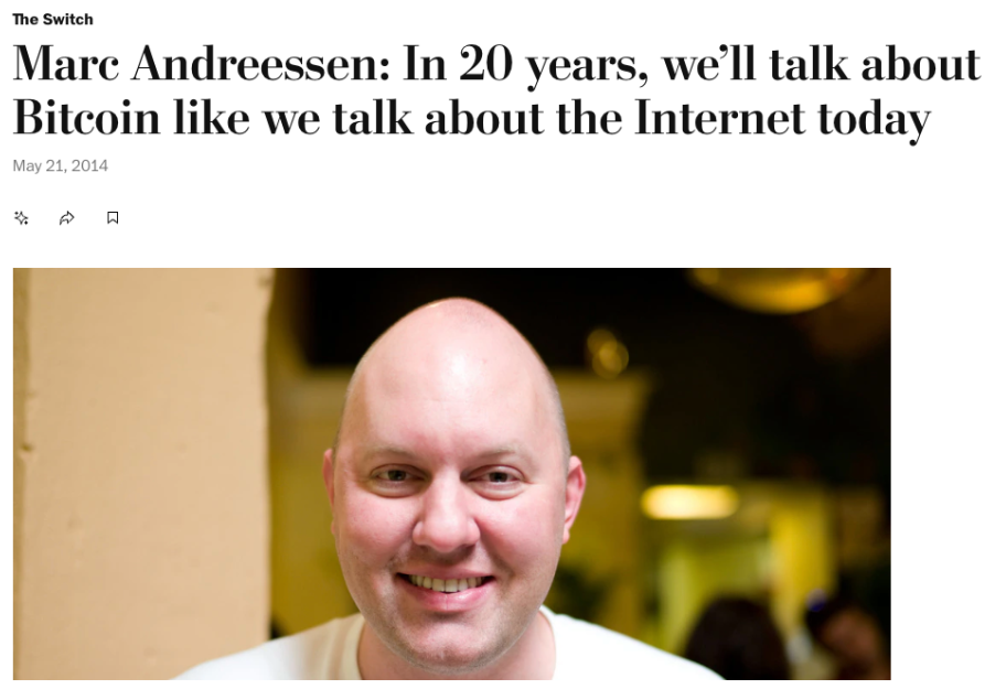 “In 20 years, we’ll talk about Bitcoin like we talk about the internet today,” Andreessen said. It might be an old adage now, but the sentiment was a big deal in 2014. After all, it had come from one of the original architects of the 90s internet boom. Who else would know better?