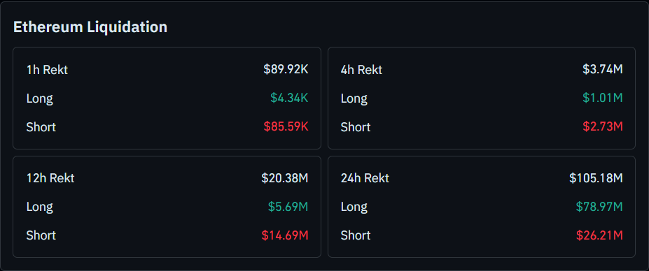 Further, liquidation data shows how violently leverage has been reset around Ethereum’s latest move. Over the past 24 hours, roughly $105.18 million in positions have been wiped out, with about $78.97 million in longs liquidated versus $26.21 million in shorts. That skew toward long liquidations confirms that the first leg of the move was driven by aggressive selling, forcing over-leveraged bullish traders out of the market.