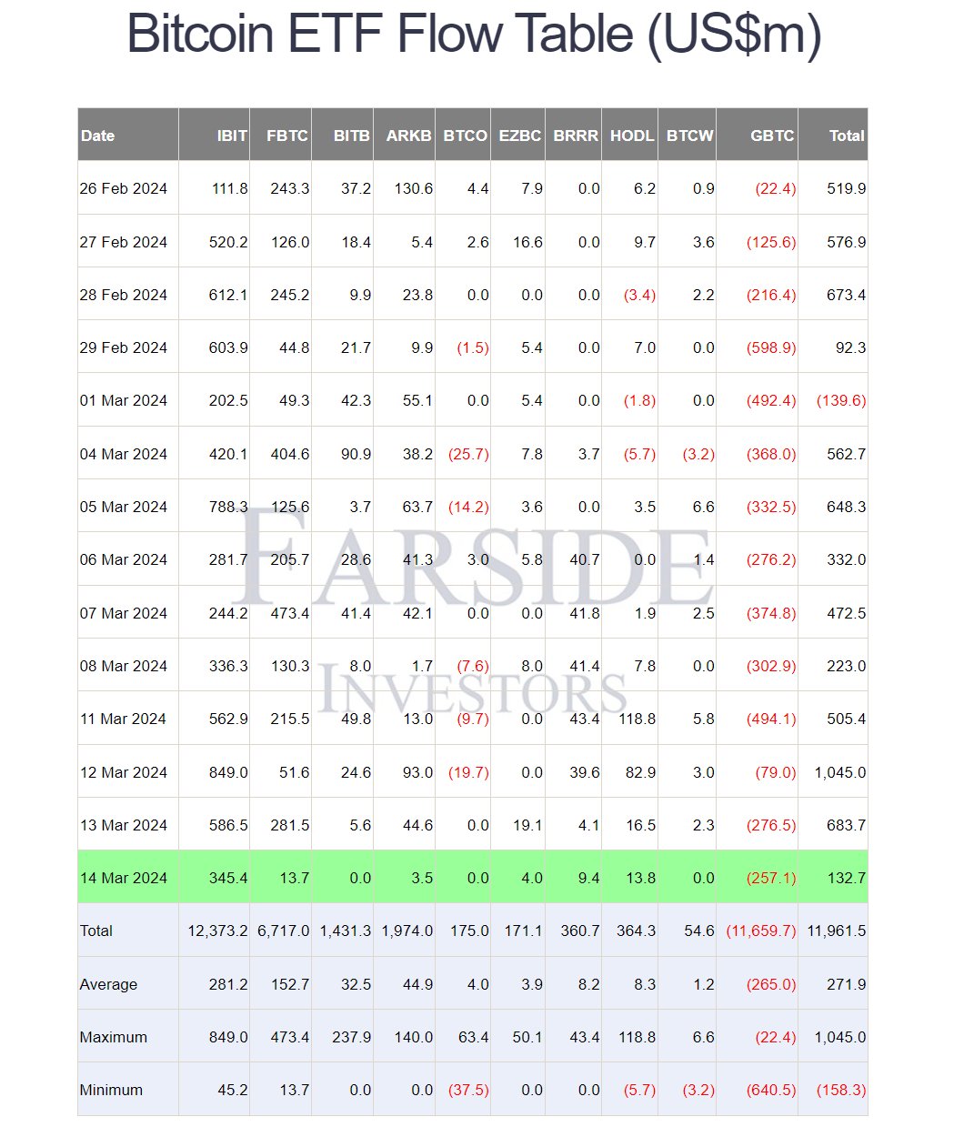Following a record $1 billion net inflow day for the spot ETF on March 12, inflows dropped to just $132.7 million recently, with Blackrock contributing the lion’s share at $345.4 million. Meanwhile, Fidelity and ARK saw minimal inflows of $13.7 million and $3.5 million respectively, after a previously strong week. GBTC outflows were reported at $257.1 million, aligning with average levels.