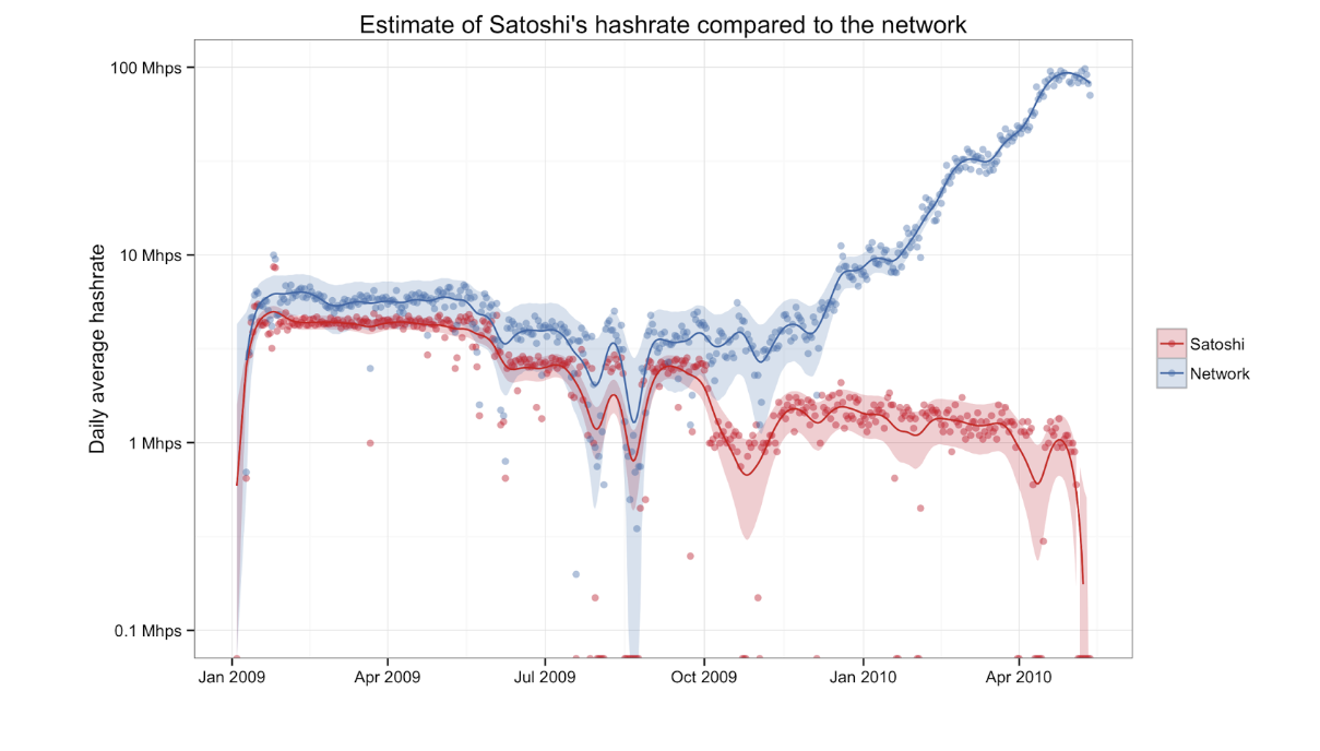 Satoshi’s estimated hash rate is in red, the total network is in blue. Notice red and blue are positively correlated until late 2009, implying Satoshi dominated mining for almost a year (source).