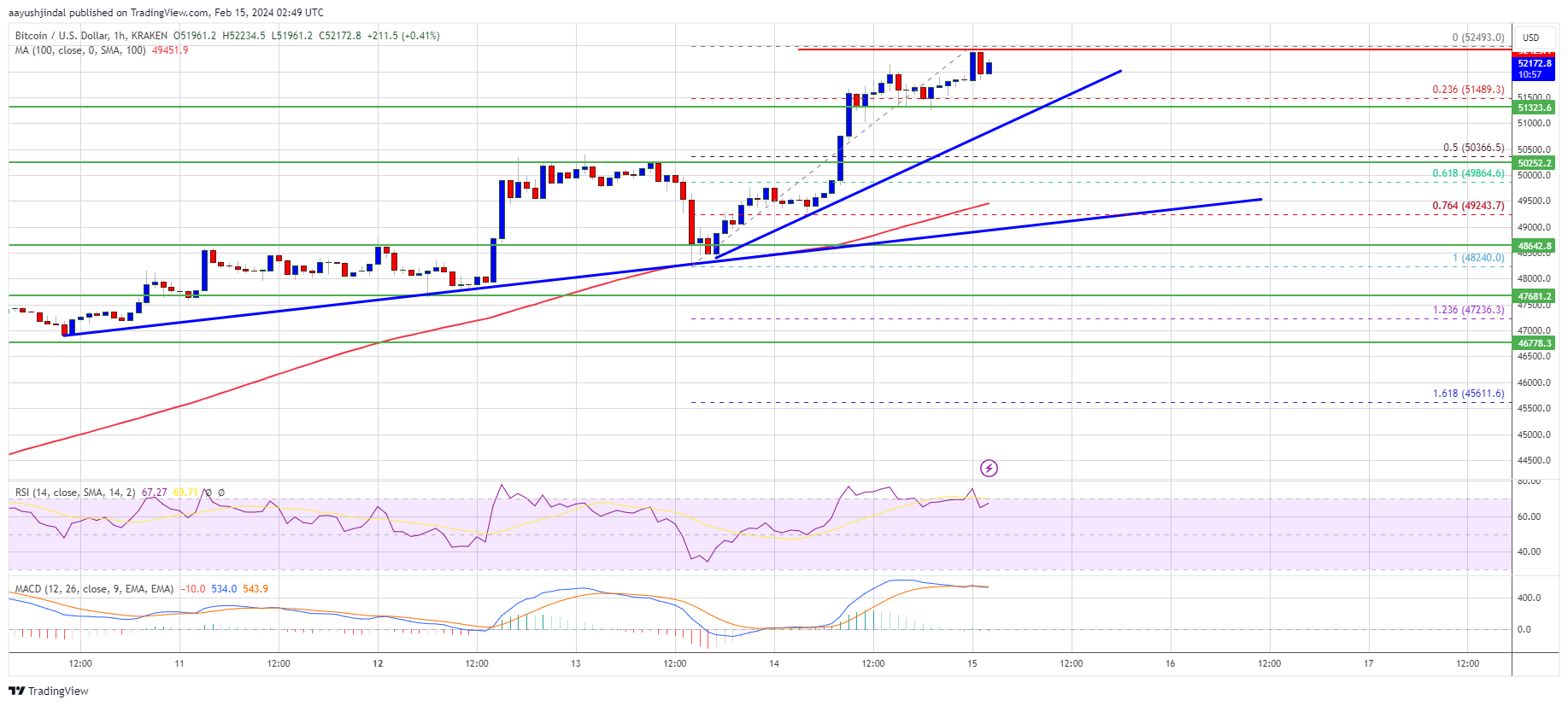 A new multi-week high was formed near $52,493 and the price is now consolidating gains. It is holding gains above the 23.6% Fib retracement level of the recent wave from the $48,240 swing low to the $52,493 high. There are also two bullish trend lines forming with support at $51,450 and $49,200 on the hourly chart of the BTC/USD pair.