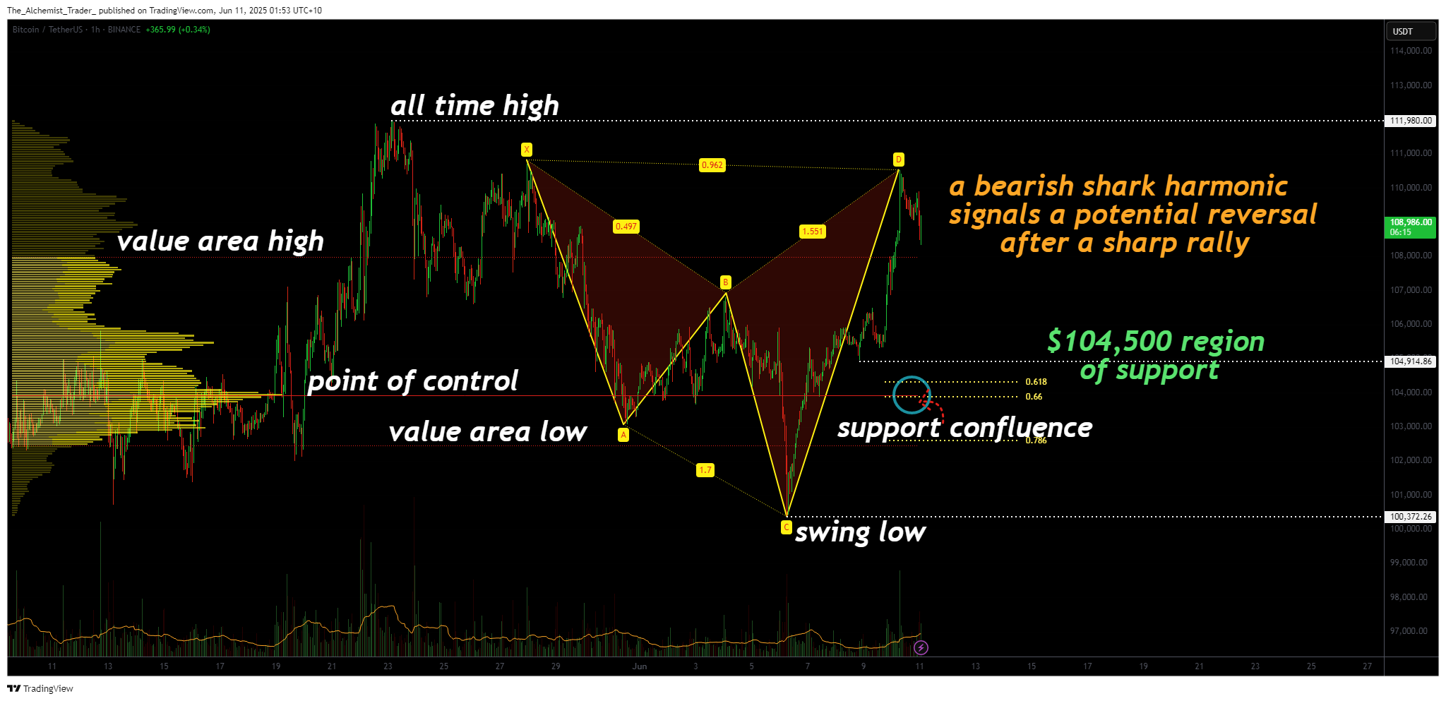 A newly confirmed bearish shark harmonic pattern has formed on Bitcoin’s intraday chart, pointing to a potential retracement in the short term. With the value area high now under pressure and volume metrics signaling a lack of strong buyer commitment, Bitcoin may be setting up for a healthy pullback into deeper volume-supported zones.