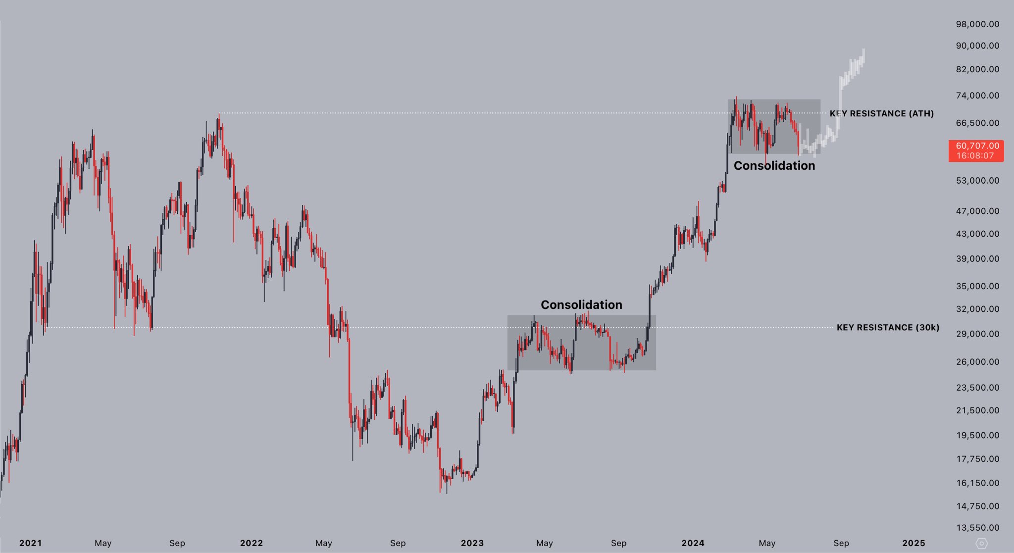 If it were to happen, Bitcoin would see a “chop summer” below the new key resistance, the $74,000 ATH price, before breaking out. According to Jelle, the breakout could cost BTC $100,000.