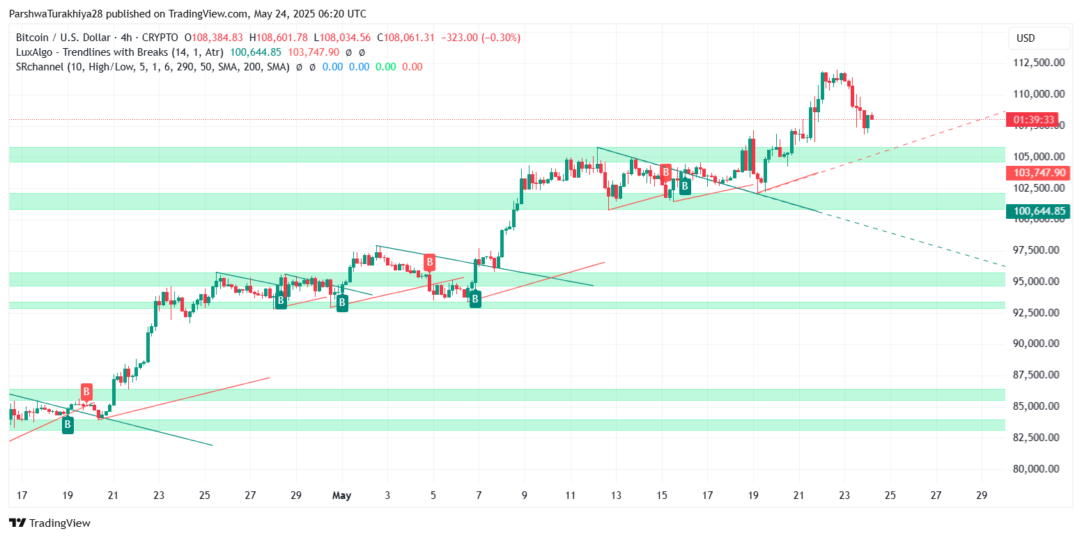 This drawdown comes despite a strong upward channel visible on the 4-hour timeframe since May 7. The price is now testing the median line of that rising channel, signaling a moment of truth for bulls. If this support fails, we may see a deeper retracement toward $105,900.