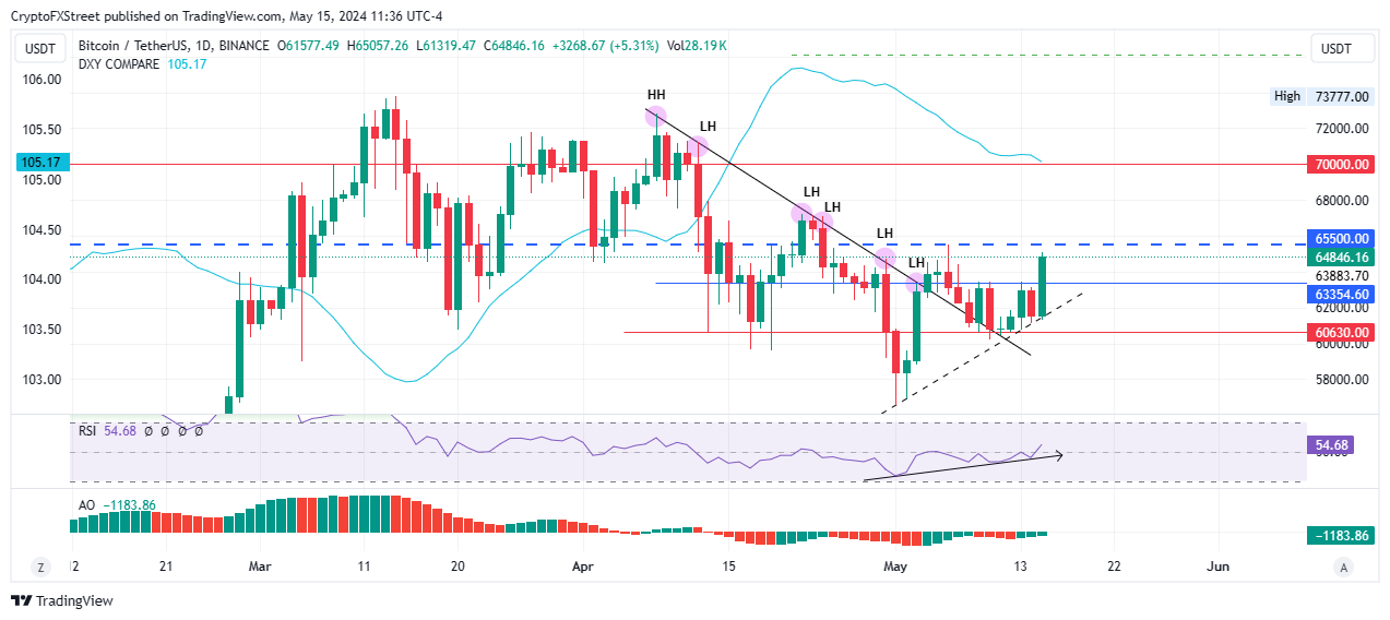 For this to happen, however, Bitcoin price must break and close above $65,500 on the one-day time frame. The Relative Strength Index (RSI) is also posting higher lows, suggesting growing bullish momentum. This coupled with the Awesome Oscillator (AO), whose histogram bars are green and pulling toward positive territory, suggests bullish sentiment is growing.