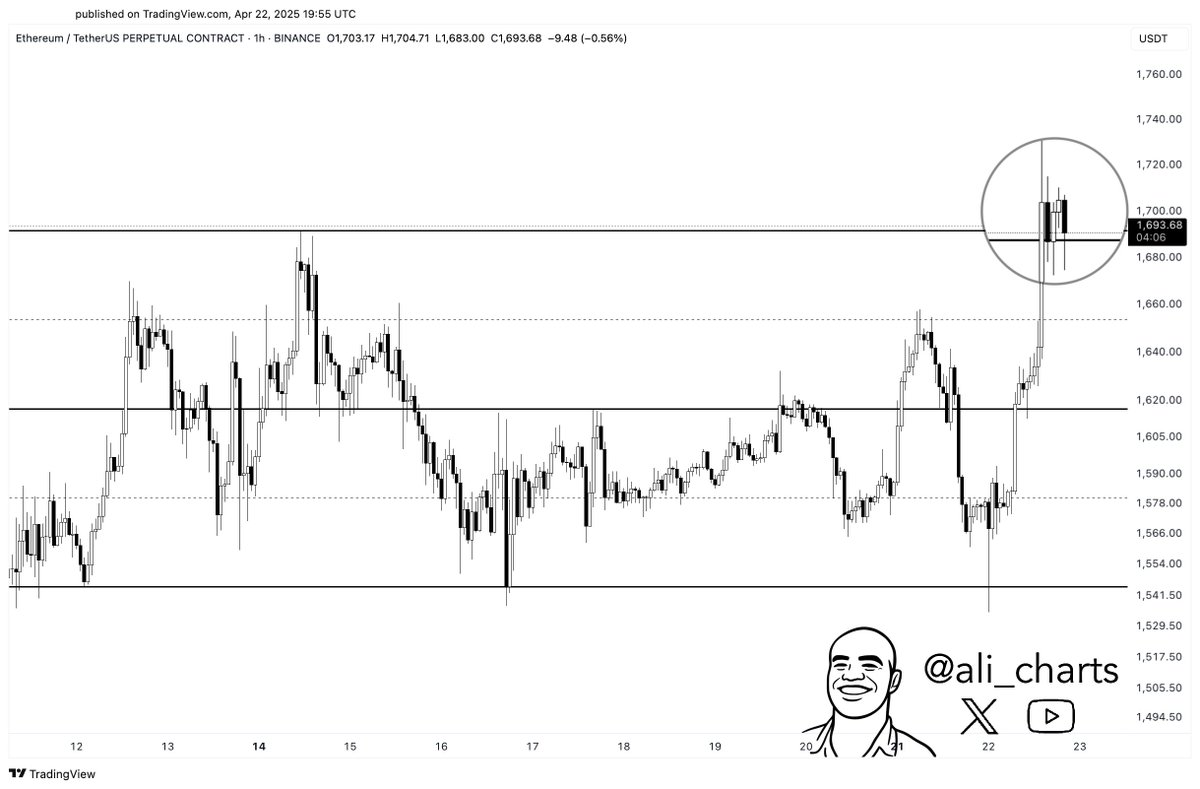 Market analysts shared charts indicating a bullish continuation was possible if Ethereum held support above $1,693.