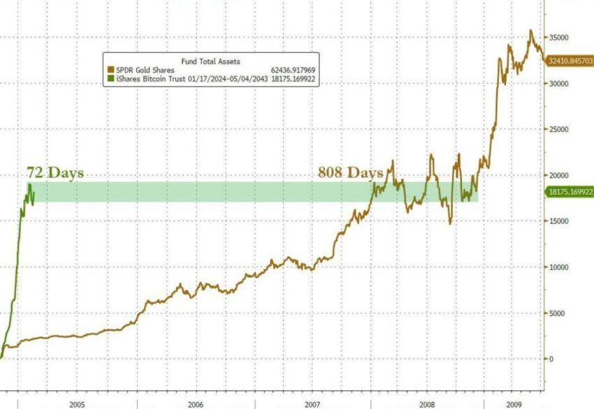 However, according to a post by crypto YouTuber Altcoin Daily on X (formerly Twitter), the BlackRock Bitcoin ETF achieved in 70 days what took the gold ETF over 800 days in assets under management (AUM). He highlighted the unprecedented demand for Bitcoin compared to gold’s initial days in the ETF sphere.