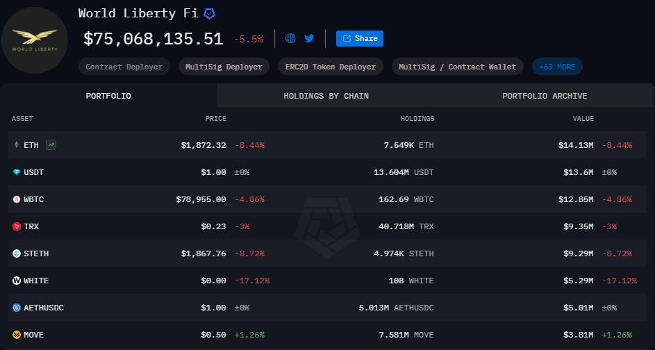 World Liberty Fi retains its TRON (TRX) holdings, which have also posted the smallest losses. The fund also expanded its Movement (MOVE) holdings. Overall, World Liberty Fi decreased its token selection, removing some of its tokens from the main wallet.