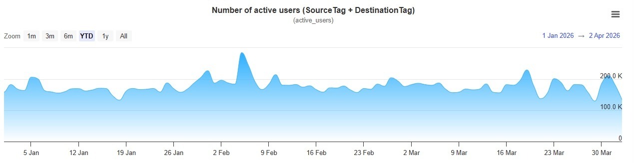 Although the number of addresses on the XRPL has risen linearly year-to-date (YTD), active users remained range-bound between approximately 130,000 and 165,000 for most of Q1, as per metrics from XRPSCAN. This suggests that while new accounts are being created, many investors may be registering addresses without engaging in trading activity.