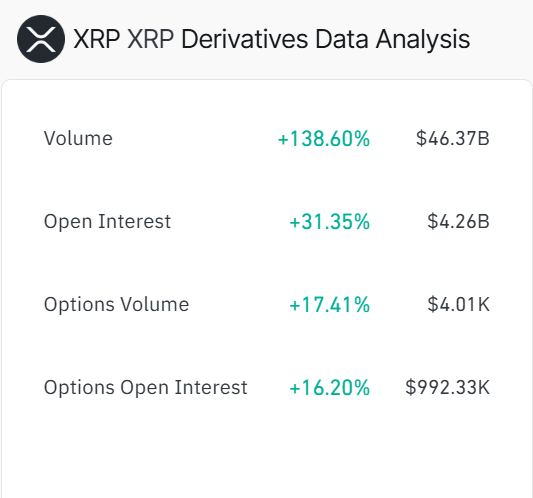 Notably, XRP’s multi-year price uptick and flourishing ecosystem have increased market participants’ appetite for leveraged trading. Data from Coinglass shows that 24-hour derivative trading volume has surged to $46.37 billion, up over 138% from the previous day.