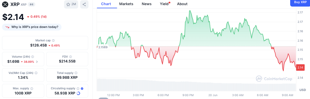 XRP’s circulating supply remains steady at approximately 58.93 billion tokens, with a capped maximum supply of 100 billion. The fully diluted valuation is near $214.55 billion. Intraday price movements showed XRP peaking close to $2.17 before retreating, indicating cautious trading sentiment.