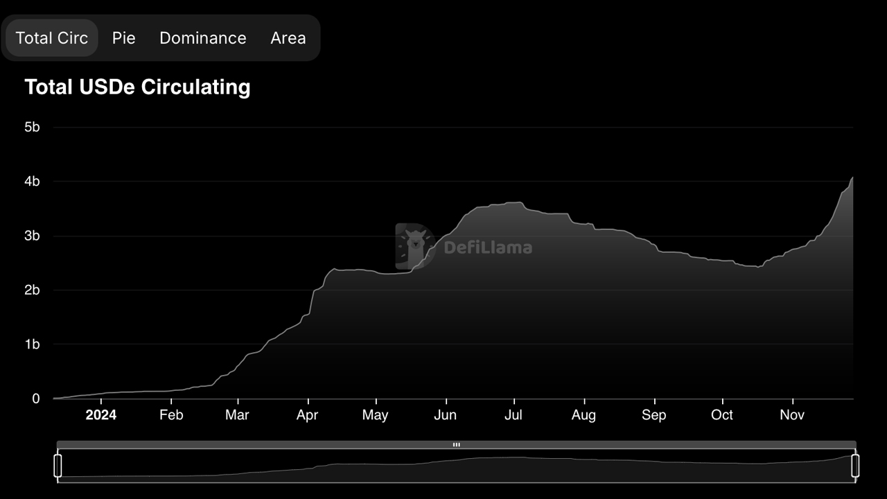 USDE holders benefit from funding rates tied to perpetual contracts and staking rewards on the Ethereum network. As of Nov. 28, 2024, the annual percentage yield (APY) sits at 29%, far outpacing most competitors in the space. This sky-high APY has drawn a significant number of holders, driving the USDE supply to an all-time high of $4.12 billion, distributed across 19,174 unique addresses.