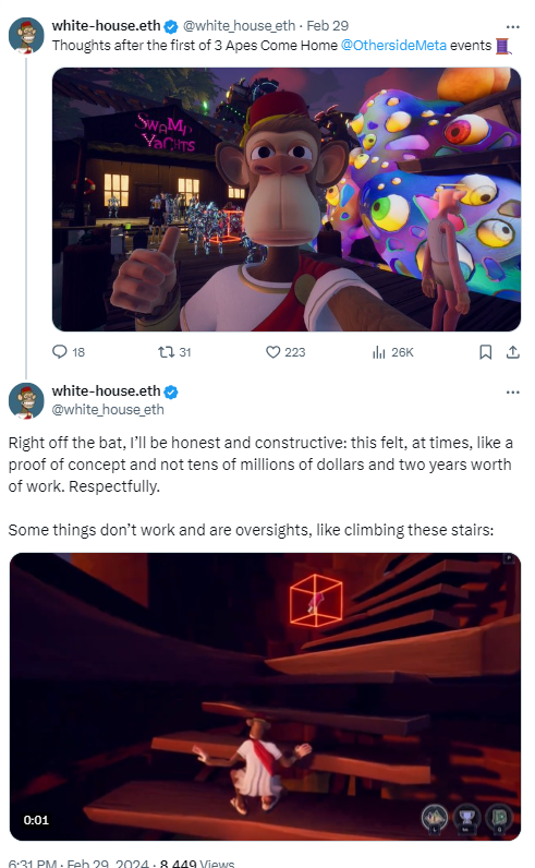 In a review, a user shared that it goes by the pseudonym white-house.eth. In an X post, they said that their experience on the “otherside” is more like a proof of concept than tens of Millions of dollars and two years of work.